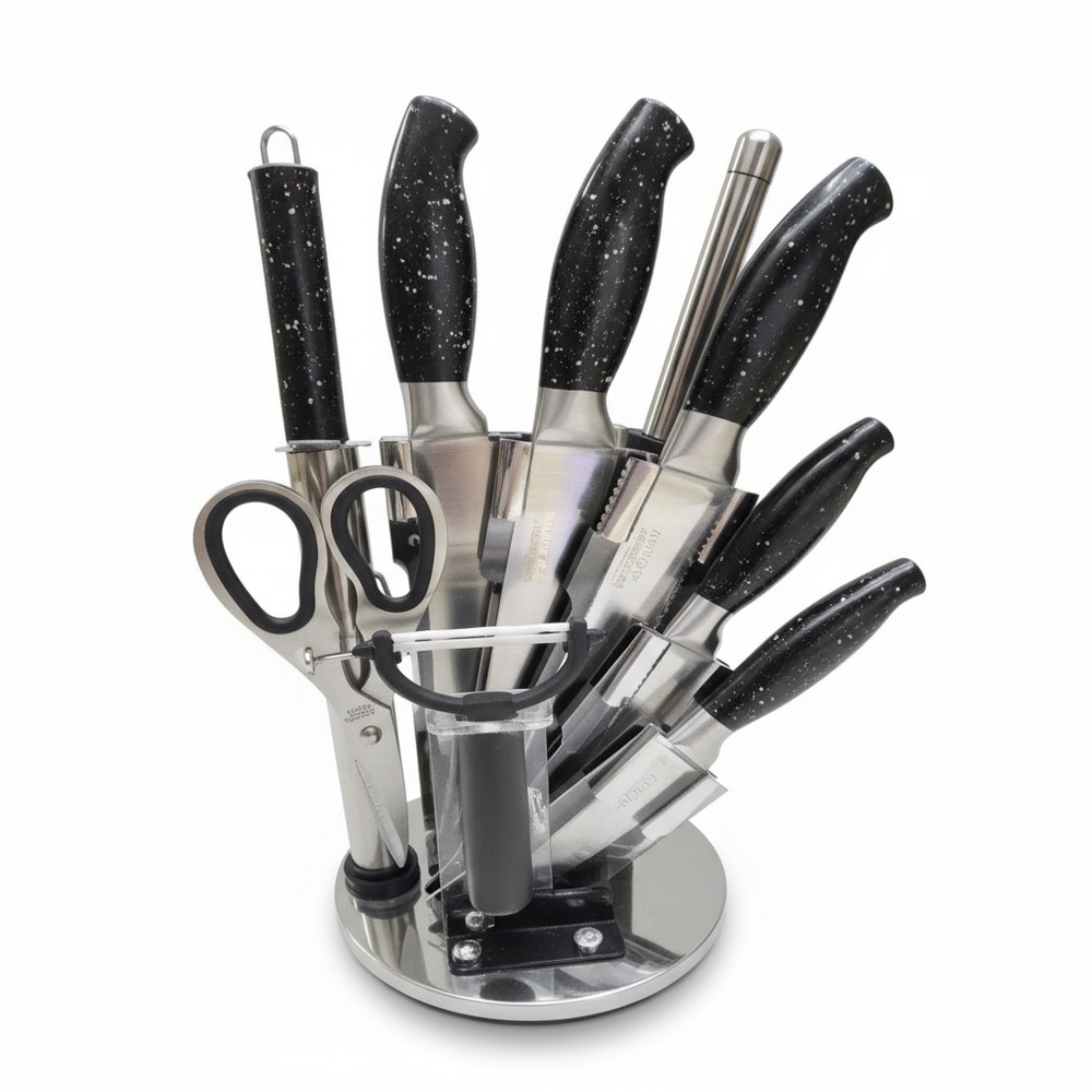 Set de cutite metalice de bucatarie, suport plastic, 7 piese, negru